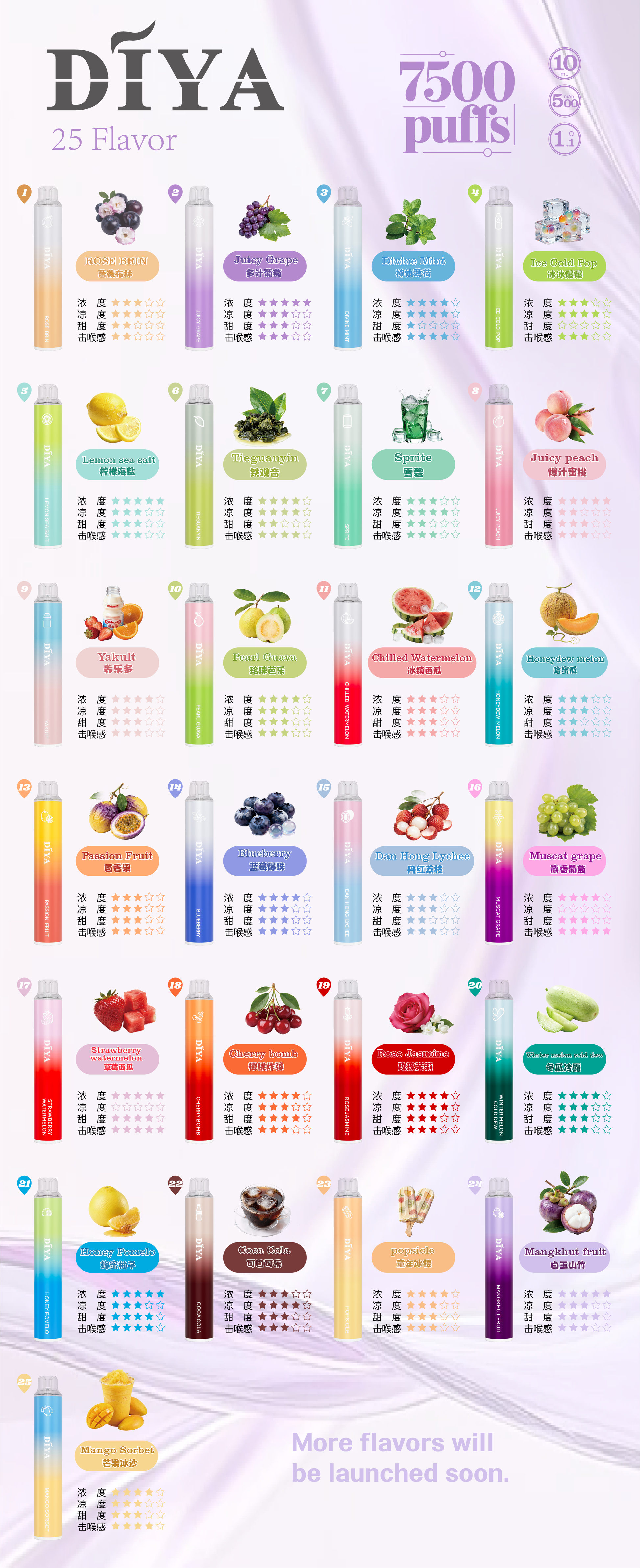 嘿,煙民們!準備好迎接一款超炫的電子煙了嗎?DIYA叮啞7500口拋棄式電子煙來了!這款新款7500口puffs的油倉加長版設計,簡直是為你量身定做的,無論你是喜歡悠閒享受還是快速來一口,它都能滿足你!