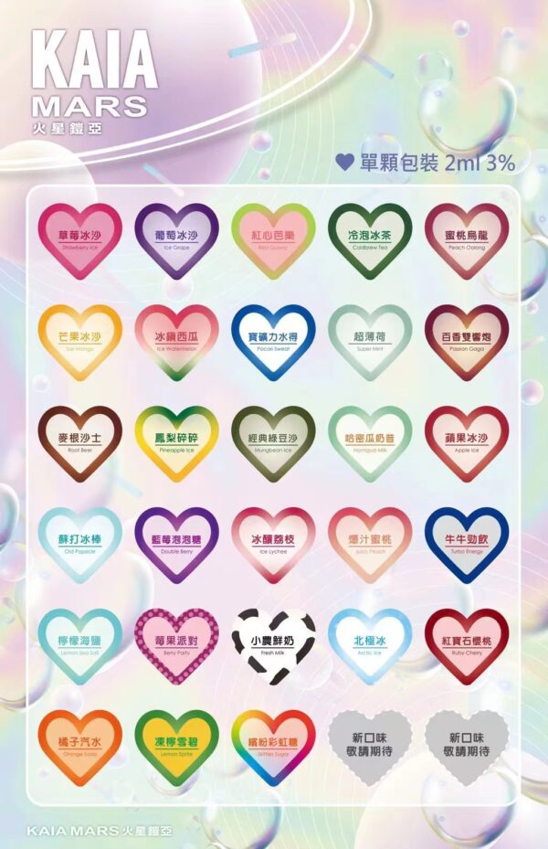 - 體驗前所未有的順滑口感與豐富選擇,【KAIA凱亞】火星凱亞一代煙彈適合追求極致風味的您。每顆煙彈容量為 2ml,含有 3%尼古丁濃度,專為提供理想的滿足感而設計。