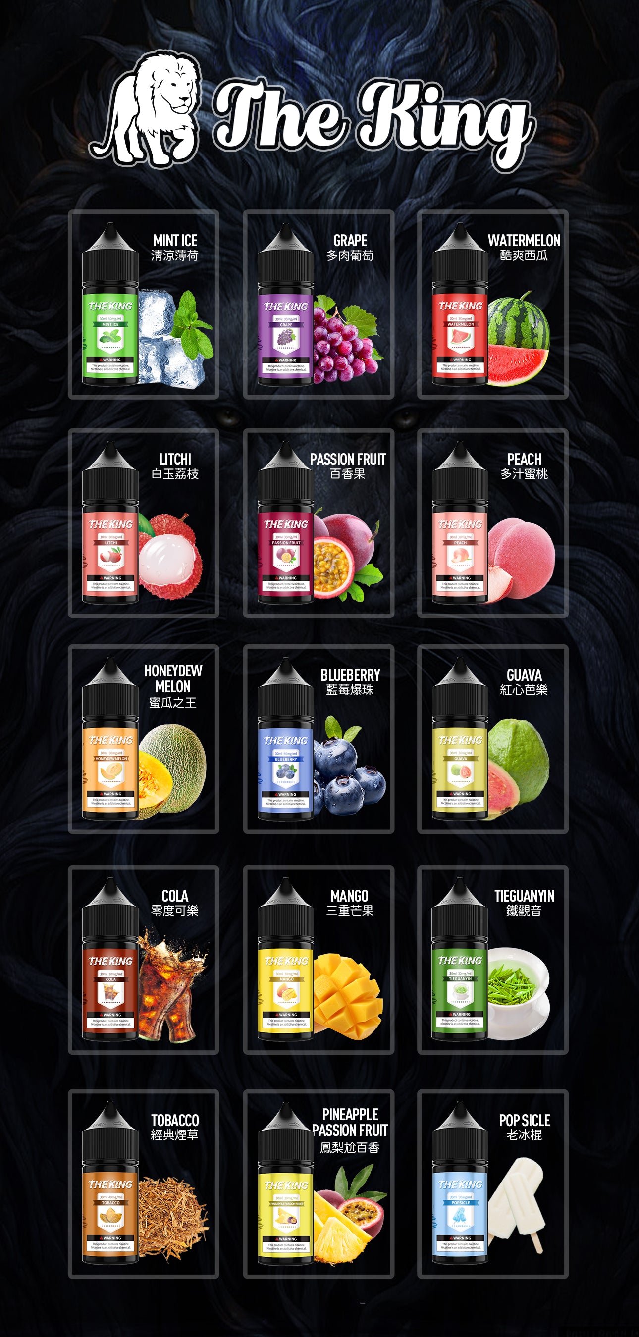 選擇 The King 王者煙油,在煙霧中感受貴族般的享受與尊榮!每一瓶 30ml 的煙油,都是對生活品味的完美詮釋,帶你開啟一段美妙的味覺冒險!快來一起享受這場煙霧與味道的狂歡吧!💨✨